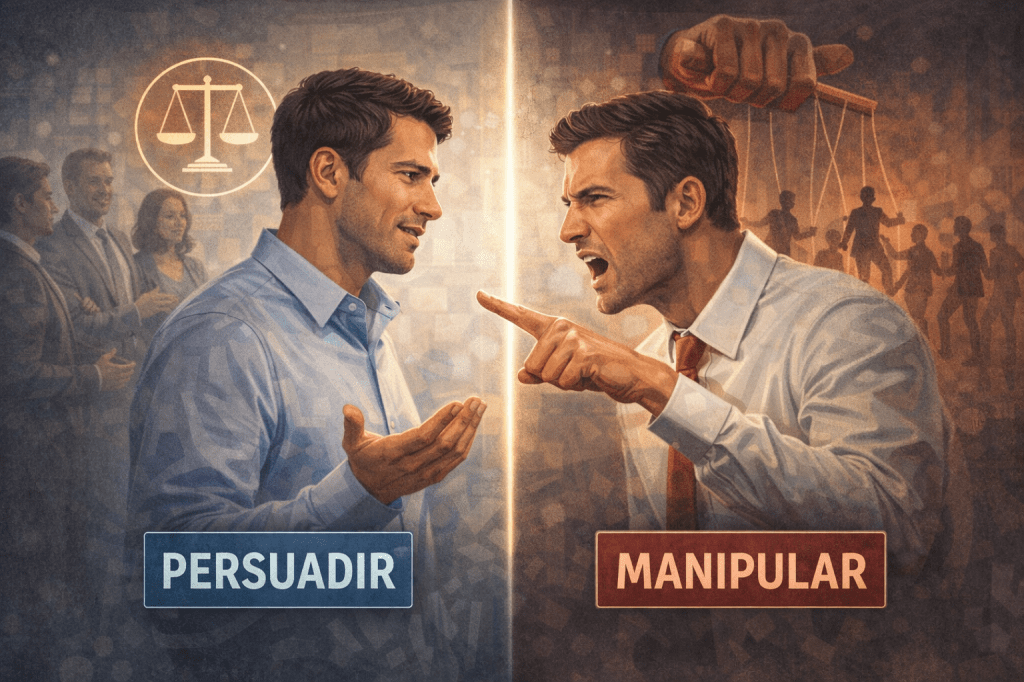 Essa diferença parece sutil, mas muda tudo. Persuadir com ética é criar clareza, contexto e confiança para que o outro enxergue valor numa ideia. Manipular é empurrar uma decisão usando pressão, medo, culpa, omissão ou jogo político. Por fora, às vezes até parecem parecidas. Por dentro, são opostas.